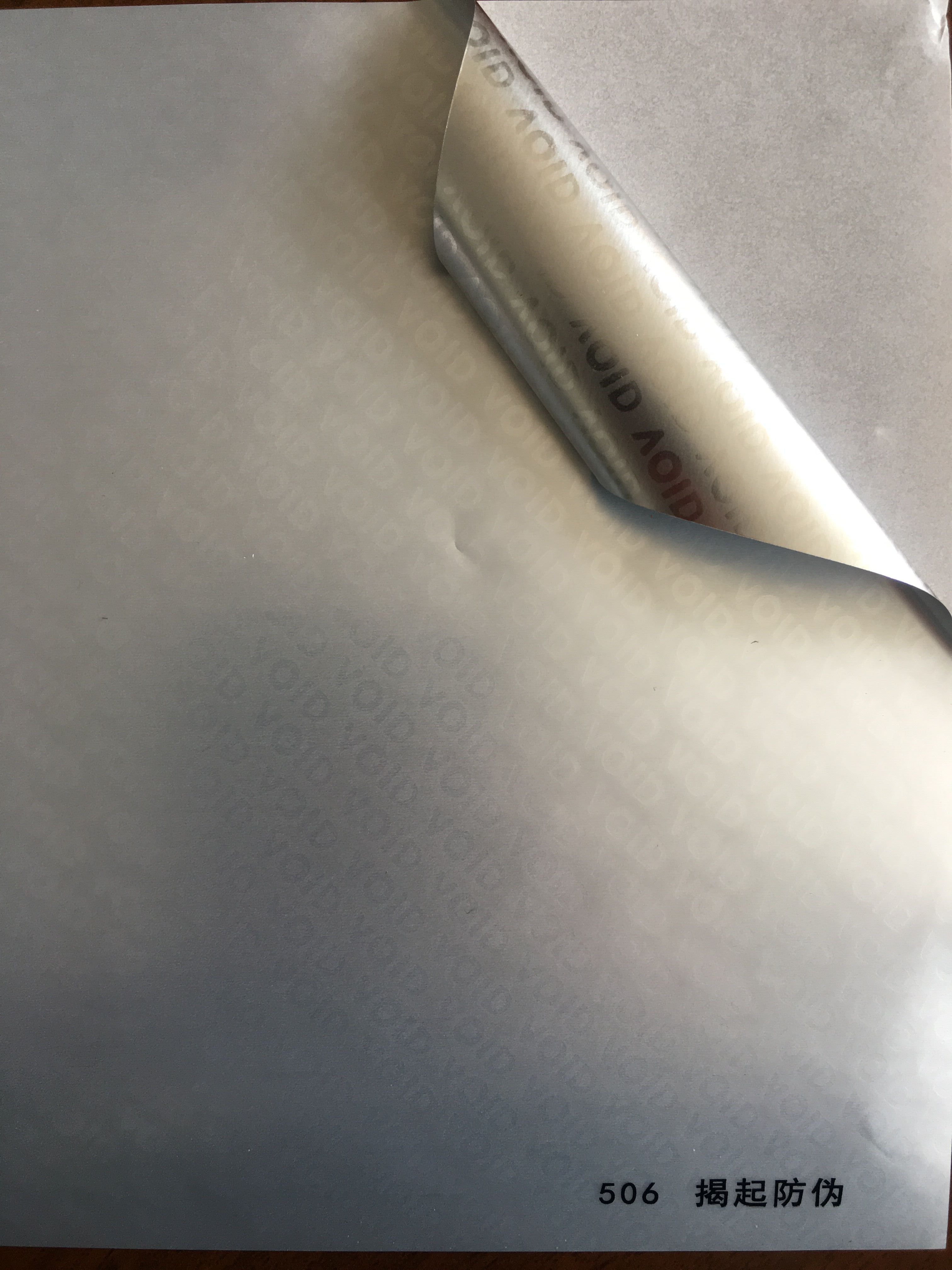 揭起防偽標(biāo)簽,是當(dāng)防偽不干膠標(biāo)簽被揭開時(shí),在不干膠面材上會(huì)產(chǎn)生明顯的、結(jié)構(gòu)性的破壞,并在承貼物表面分離出預(yù)先設(shè)計(jì)的圖案或文字(如“VOID”),且無法復(fù)原,起到阻嚇及警示作用。